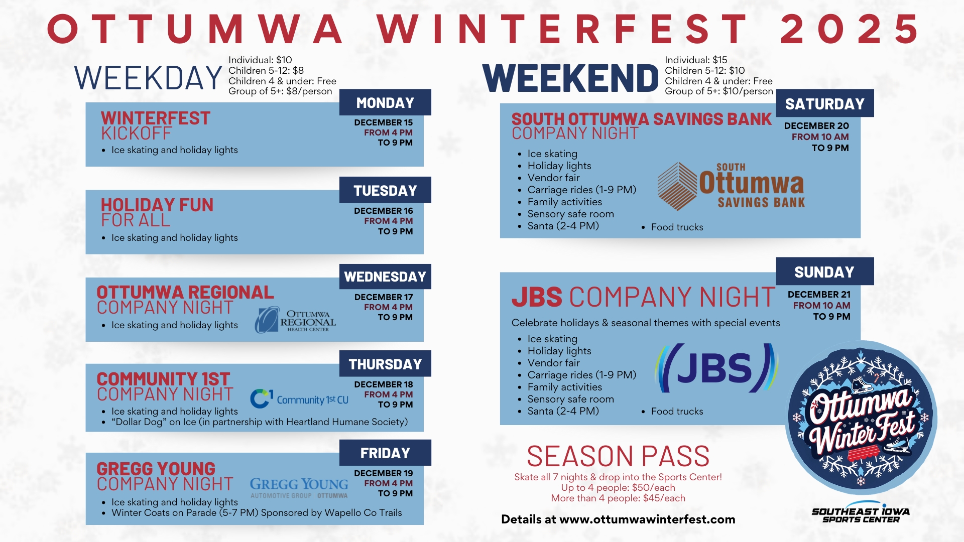Ottumwa WinterFest will take place at the Southeast Iowa Sports Center and span a full week of festive fun. With the tagline “Ice, Lights, and Local Delights,” this celebration brings together the best of the season in a new format designed for all ages.