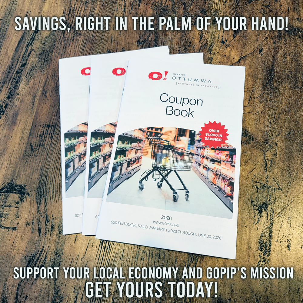 The new GOPIP Coupon Book is your key to unlocking more than $1,000 in savings from local businesses—all for only $20. Valid from January 1, 2026 through June 30, 2026, this book is packed with exclusive offers on dining, shopping, services, entertainment, and more. It’s an easy, affordable way to explore Ottumwa, discover new favorites, and support the businesses that help our community thrive.